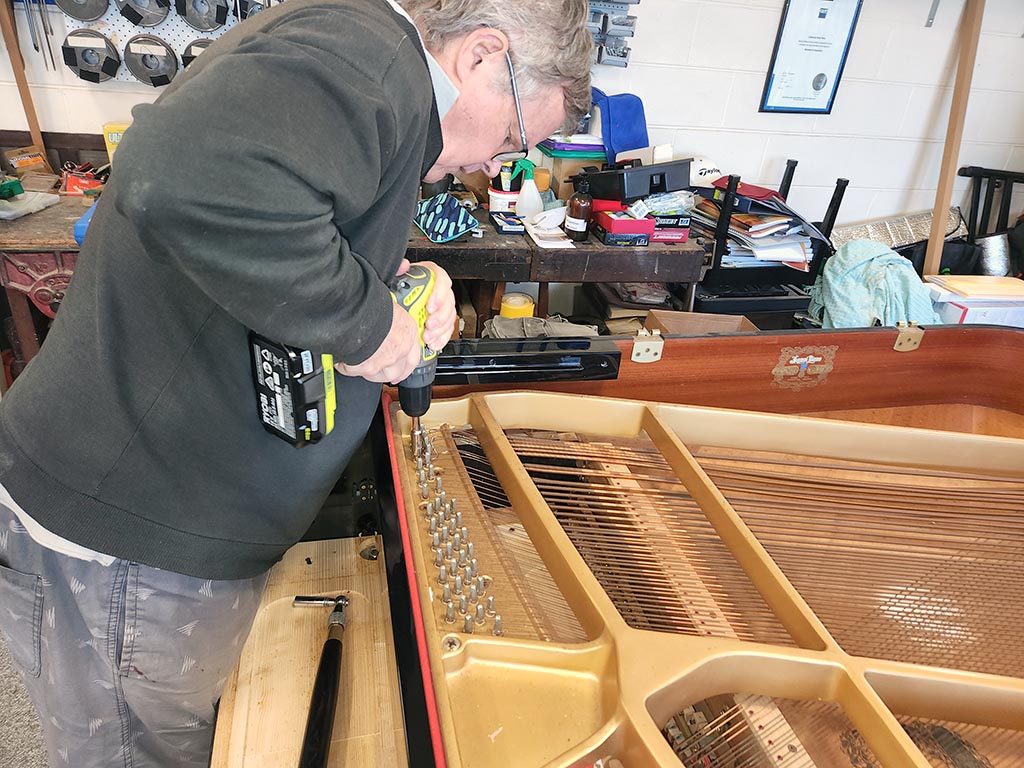 A comprehensive inspection is required before this work is carried out. The tuning plank needs to be inspected to see if the new tuning pins will hold the tension of the strings. All the bridges need to be examined to see if they are not split or cracked. Sound board and ribs need to be inspected for splits and cracks. The correct bearing on the strings over the bridges needs to be examined.